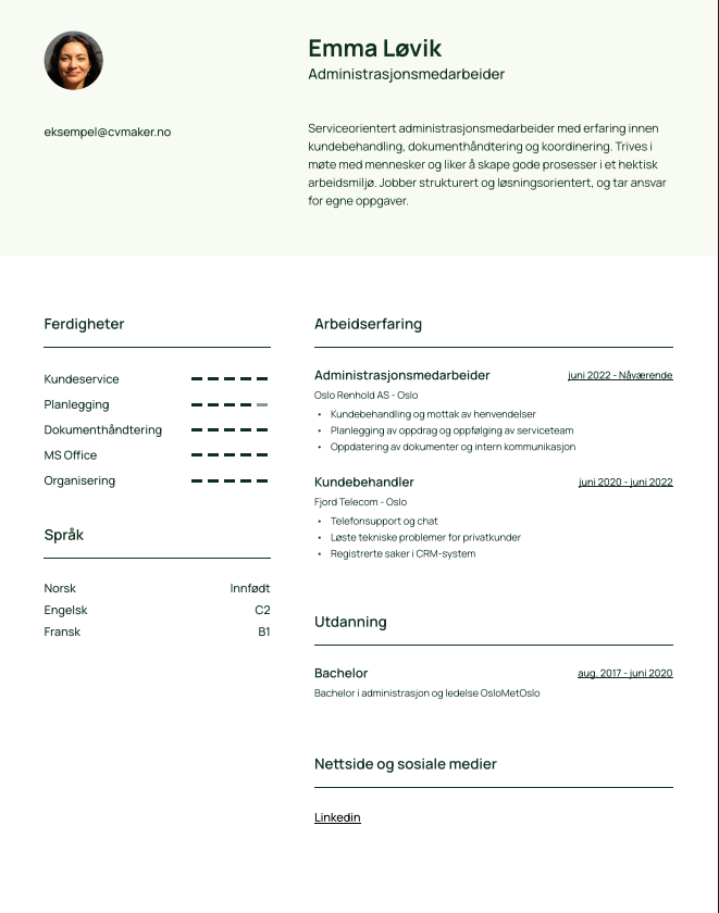 Her er et oppdatert CV-eksempel basert på en av CVMaker sine profesjonelle maler. Du kan bruke dette som inspirasjon når du lager din egen CV: