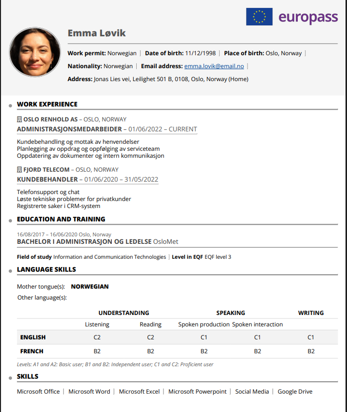 En Europass-CV er en type CV som brukes i store deler av Europa, også av mange som søker jobber fra Norge. Tanken bak formatet er å gjøre det enklere å presentere erfaring og utdanning på en måte som forstås på tvers av landegrenser. Ved å følge et fast oppsett unngår man store forskjeller i hvordan informasjonen vises, noe som særlig kan være praktisk dersom du søker flere steder i Europa.